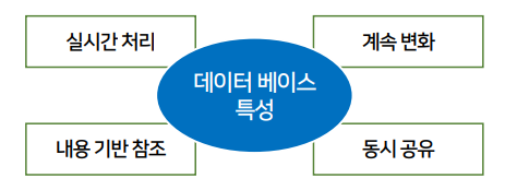 - 동시 공용, 내용에 의한 참조, 실시간 접근성, 계속적인 변화