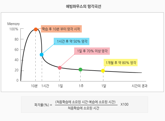 망각 곡선에 대한 내용은 최초 에빙하우스가 개발해낸 개념이며, 15년도에 네덜란드 암스테르담 대학교의 야프 뮈러 교수에 의해 이 공식이 여전히 맞다는 것을 다시 한번 증명한 사례도 있다.