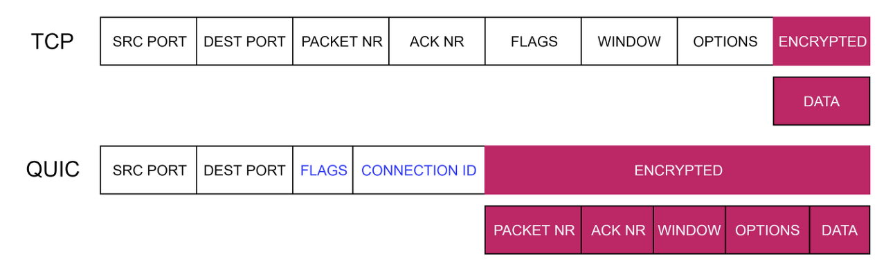 - QUIC는 운영체제 커널과 독립적으로 응용 프로그램 공간 내 구현 가능, 따라서 데이터 이동에 따른 컨텍스트 전환에 의한 오버헤드 X