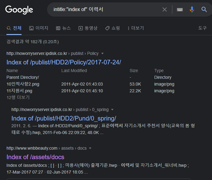 구글에 intitle:"index of" 이력서 검색하면 남의 데이터가 봐짐..