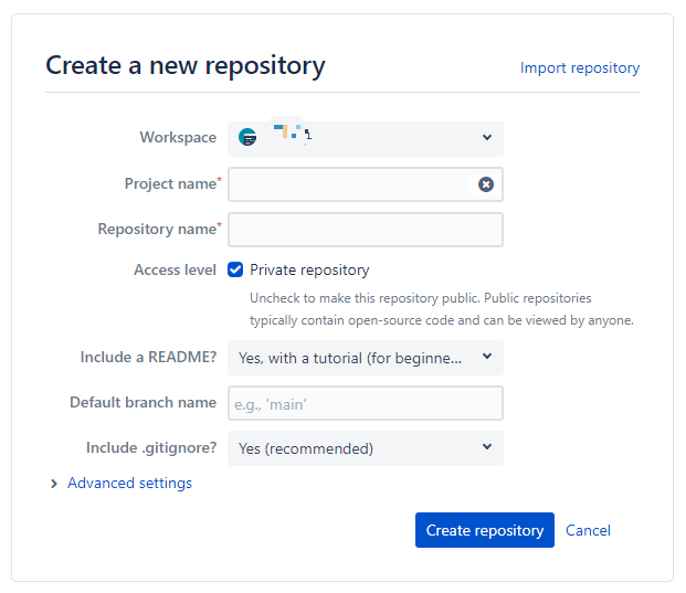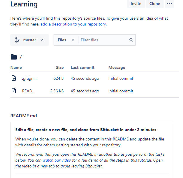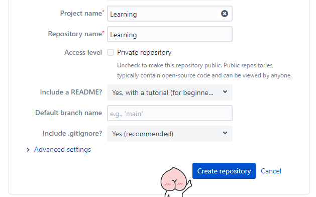 Project name에 여러 저장소를 생성할 수 있으며, 여기에서는 연습이 목적이므로 Learning으로 설정한다