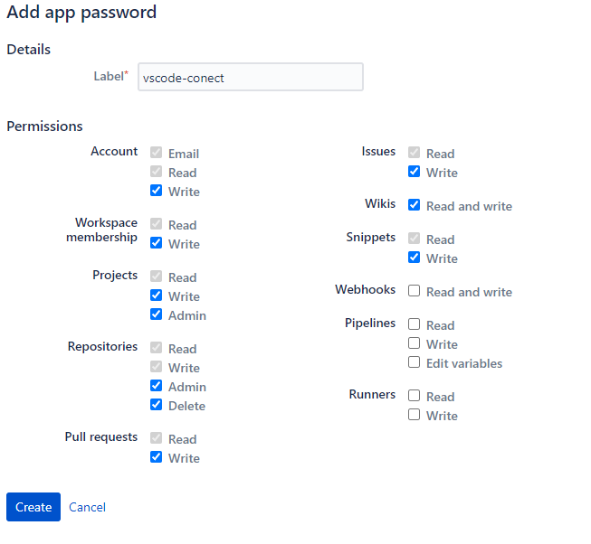 본인이 식별할 수 있는 이름을 Label에 적고, VScode를 통해 접근하는 권한 정도를 체크박스로 저장