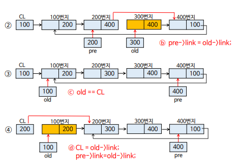 CLinkedlist remove(CL, n) //환형 연결리스트에서 주어진 노드를 삭제