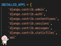 Django는 프로젝트에 urls.py에서 각 app의 url로 뿌려주는 과정을 거칩니다. app 생성 시에는 urls.py가 생성되지 않기 때문에 직접 만들어줘야 합니다. api 폴더내에 urls.py 파일을 만들고 다음의 내용을 적습니다