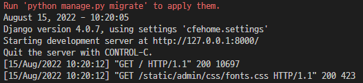 브라우저로 http://127.0.0.1:8000/ 에 접속했을 때 다음과 같은 GET 방식의 로그가 발생하며,