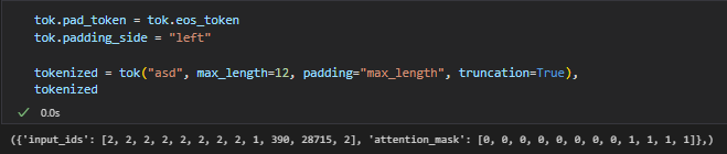 토크나이저는 값을 입력할 때, 좌측 padding된 2 값을 0으로, eos 토큰 역할을 하는 2는 1로 마스킹을 정확하게 하는 것을 확인할 수 있습니다.