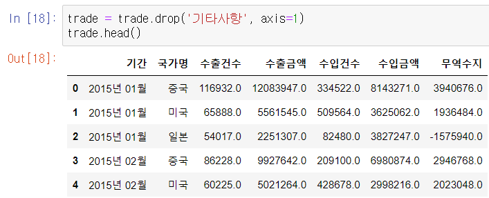 trade = trade.drop('기타사항', axis=1) #ex) df.drop('column name', axis= 1 for column)