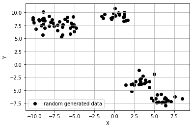 ax.scatter(points[:,0], points[:,1], c='black', label='random generated data')