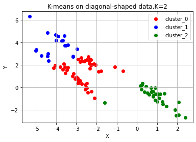 ax.set_title('K-means on diagonal-shaped data,K=2')