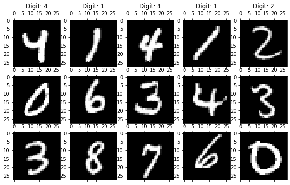 ax = fig.add_subplot(3,5,i+1, title=f"Digit: {row['label']}")