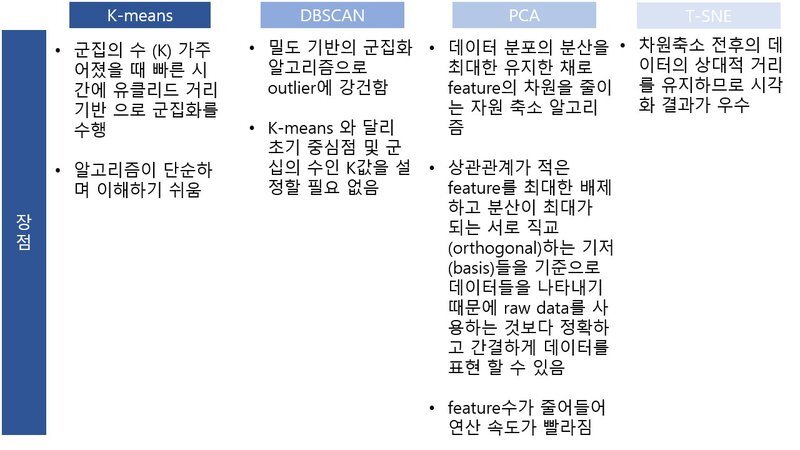 PCA는 정보손실을 최소화 하려고 주성분이라는 물리적 의미를 유지하고 공분산을 통해 원본 데이터를 일정 부분 복원할 수 있는 가능성을 가짐 - T-SNE는 정보 손실량에 주목하지 않아 저차원 축이 아무런 물리적 의미를 가지지 않음