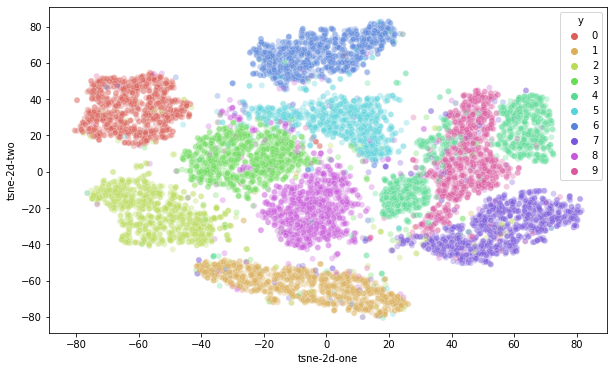 T-SNE에서는 고차원에서 먼 거리의 두 점은 저차원에서도 먼 거리에 있어야 합니다. 그러므로 결과적으로 T-SNE를 시각화하면 숫자들 사이의 경계가 뚜렷이 나타나는 장점이 있습니다. 위에서 T-SNE를 훈련시켰을 때 label 정보를 전혀 참조하지 않고 df_subset[pixel_columns] 정보만 참고하여 얻은 결과라는 점에 주목해 주세요. 그래서 T-SNE는 분류기의 Feature Extractor 모델이 카테고리 간 분류 경계선을 뚜렷하게 유지하고 있는지를 확인하는 용도로 자주 쓰입니다.