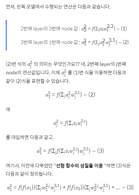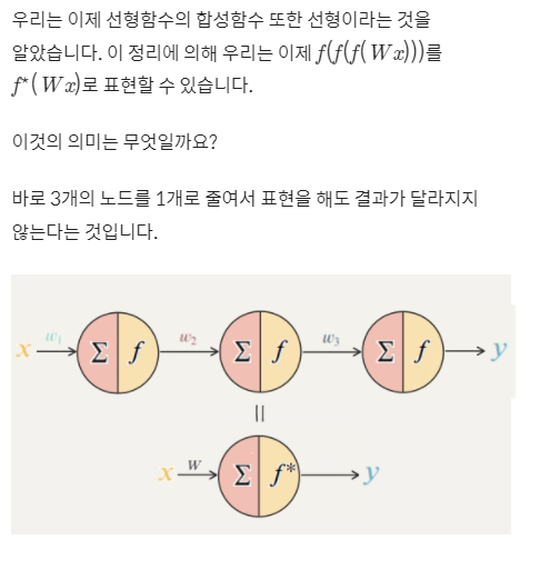 결국 선형 활성화 함수만 사용한다면 노드의 개수를 많이 붙여도 하나의 노드를 사용하는 것과 동일
