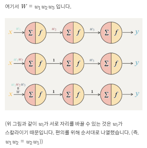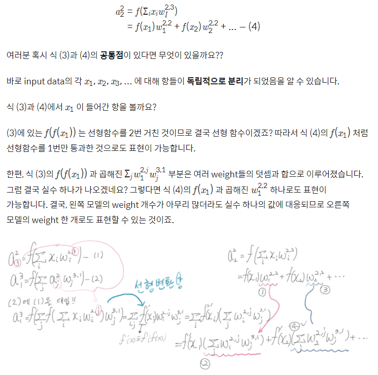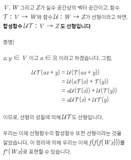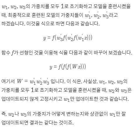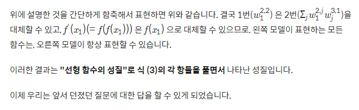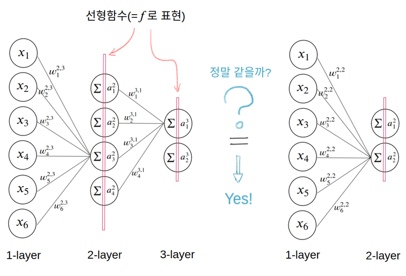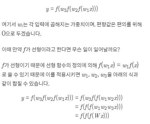 활성화 함수가 선형일 때 모델의 표현력은 증가하지 않음