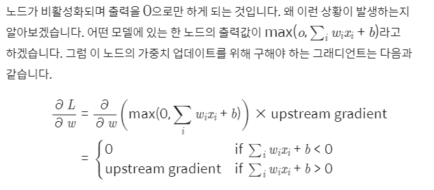 해당값이 가중치 w값에 의해 입력값 x에 상관없이 0 이하로 나오게 되면 그래디언트가 0