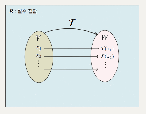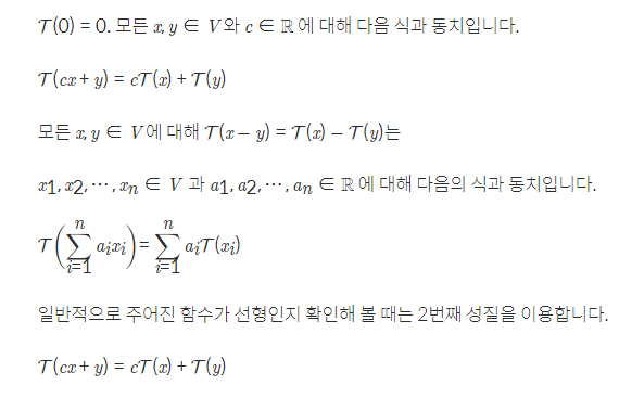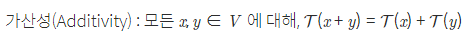 V와 W가 벡터공간이고, 둘 모두 실수집합상에 있을때, 함수 T : V - W가 다음 두 조건을 만족
