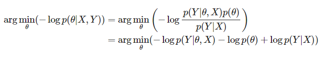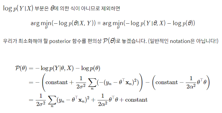 MLE에서 negative log likelihood를 최소화했던 것 처럼 MAP에서도 negative log posterior를 최소화하는 파라미터 값을 구함