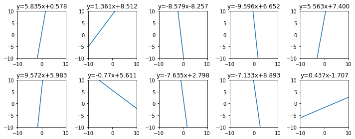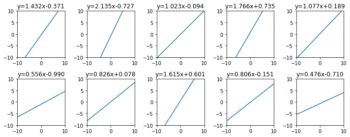 평균이(1, 0)이고 표준편차가 0.5인 정규분포의 10개 점을 무작위로 뽑고, 대응되는 일차함수의 그래프를 그려보면