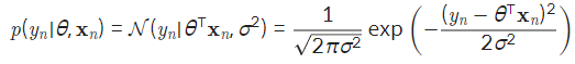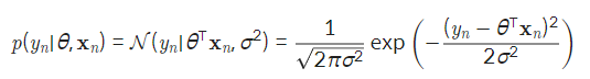 입력데이터가 xn일 때 모델의 예측값은 θ⊤xn 이고 출력값의 분포 p(yn∣θ,xn)는 노란색으로 표시한 정규분포 그래프와 동일