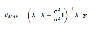 최소 제곱법의 정규화항과 같은 형태로 최소제곱법에선 손실함수에 파라미터의 크기에 관한 식을 더해줌으로써 파라미터가 큰 값으로 튀는 것을 막고 오버피팅을 예방했다면 조건의 MAP에서는 파라미터 분포를 평균이 (0,0)인 정규분포로 놓아서 파라미터들이 각각 0에 가까운 값으로 학습되도록 제약 조건을 걸어줌