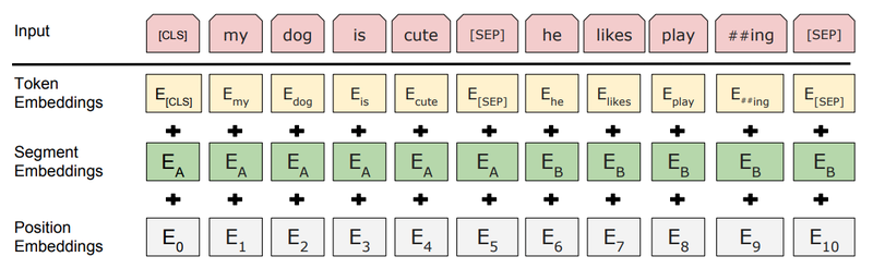 모델에 입력되는 것은 Token , Segment, Position Embedding 3가지가 더해져서 입력되며, 그 이후