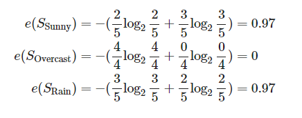 F가 Outlook일 때 즉 f가 Sunny, Overcast, Rainy중 하나일 때 엔트로피