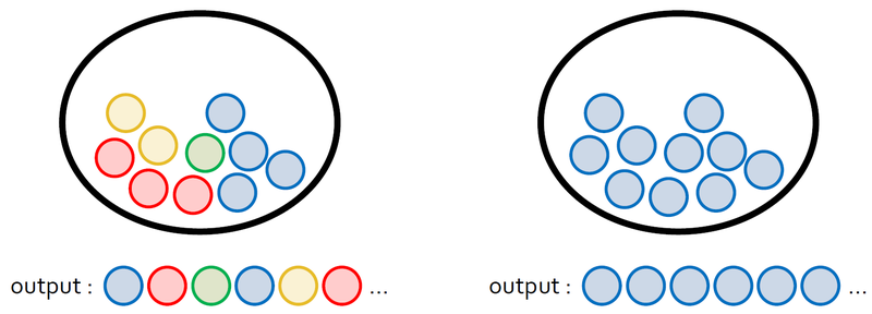 주머니에 공 10개가 있고 모두 다른색일 경우 −(0.1log0.1)×10≈2.3로 최대값