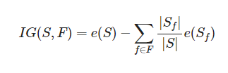IG(S,F)는 F라는 분류 기준을 선택했을 때 채택을 통해 얻은 정보 이득의 양