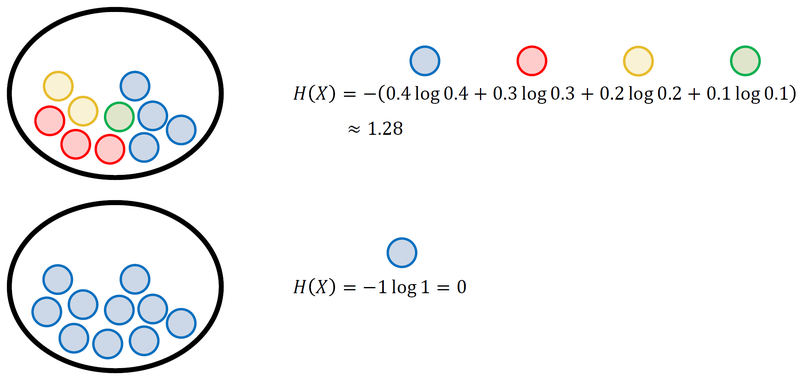 첫번째에 특정 색깔의 공이 뽑힐 확률이 각각 0.4, 0.3, 0.2, 0.1이므로 엔트로피는 약 1.28