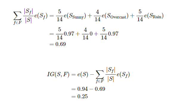 - : 는 F 에 속하는 속성 (예를 들어 가 Outlook일 때, f는 Sunny, Overcast, Rainy 중 하나가 될 수 있다. )