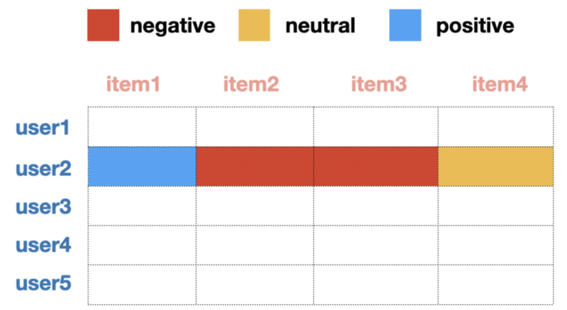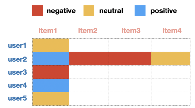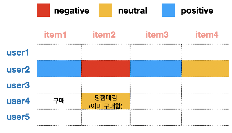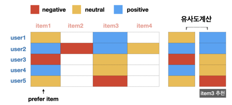 User2가 User4와 비슷한 고객일 때 User2가 선호한 제품인 item3을 User4에게 추천하는 방식
