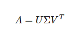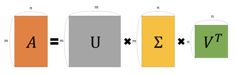 특이값 분해로, M * N 형태 행렬 A를 다음과 같은 형태로 분해하여 표현