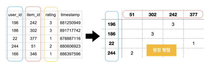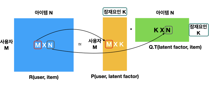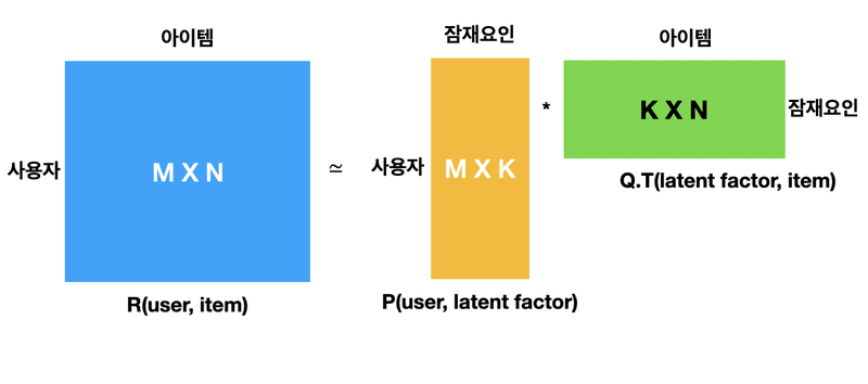 - Q: 아이템과 잠재요인 사이의 행렬 -> 전치 행렬 형태로 나타냄