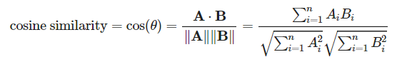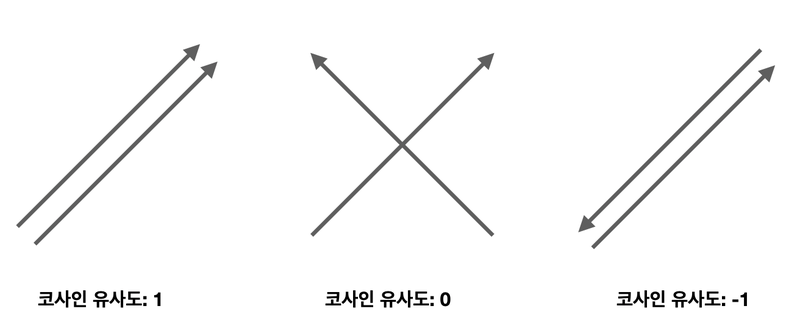 두 벡터의 방향이 이루는 각에 코사인을 취해 구하는 유사도로 방향이 동일할 경우 1, 90도 각을 이루면 0,
