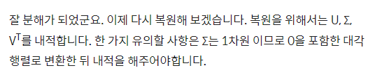 SVD 기법으로 분해 후 합치는 방법으로 이를 벡터화하여 추천