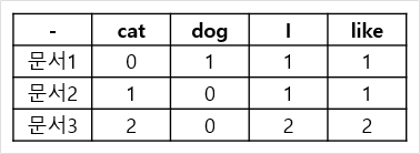 행렬안에 불필요하게 0이 많은 모습.. 문서수가 많으면 통합 단어장의 크기도 커져서 DTM은 문서와 단어 벡터 대부분의 값이 0이 되는 성질이 있음