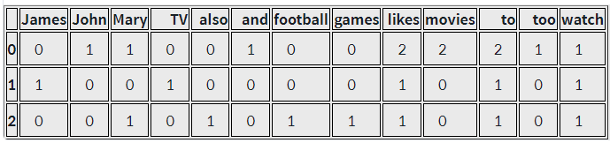 Bag of Words : {'john': 1, 'likes': 3, 'to': 2, 'watch': 2, 'movies': 2, 'mary': 2, 'too': 1, 'also': 1, 'football': 1, 'games': 1}