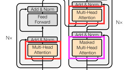 보라색의 구조는 Multi-Head Attention과 동일하지만 인과 관계 마스킹이라는 과정이 더 추가됩니다