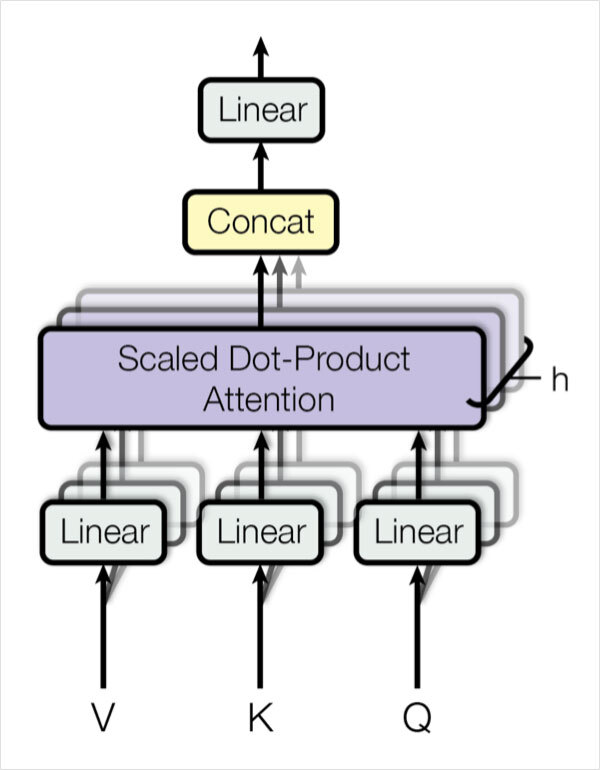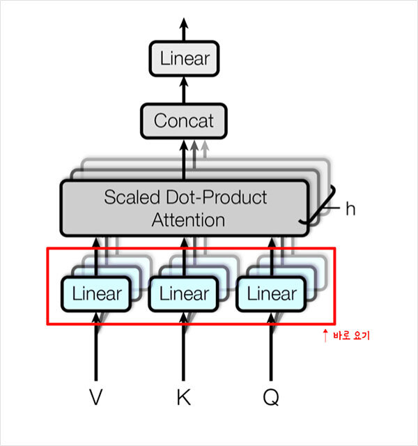 Multi-Head Attention 모듈은 Linear 레이어와 Scaled Dot-Product Attention 레이어로 이루어짐