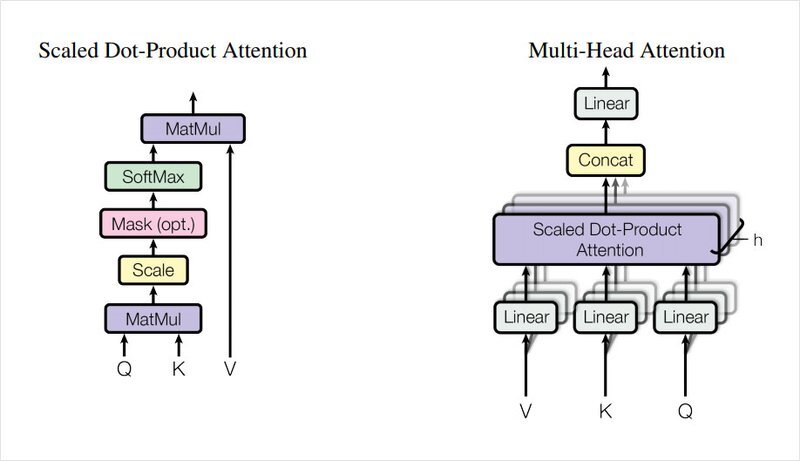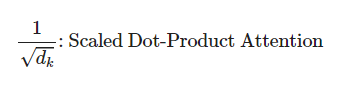 즉, Scaled Dot-Product Attention은 Additive(합 연산 기반) Attention과 Dot-Product(=Multiplicative, 곱 연산 기반) attention 중 후자를 사용한 Attention이고 차원 수가 깊어질수록 Softmax 값이 작아지는 것을 방지하기 위해 Scale 과정을 포함 한 것