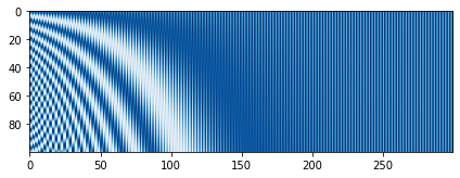 plt.imshow(positional_encoding(100, 300), cmap='Blues')