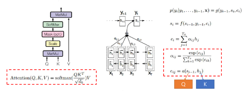 디코더의 state를 Q(query), 인코더의 state를 K(key)로 추상화 되었으며 이 2개의 유사도의 dot product를 계산하여
