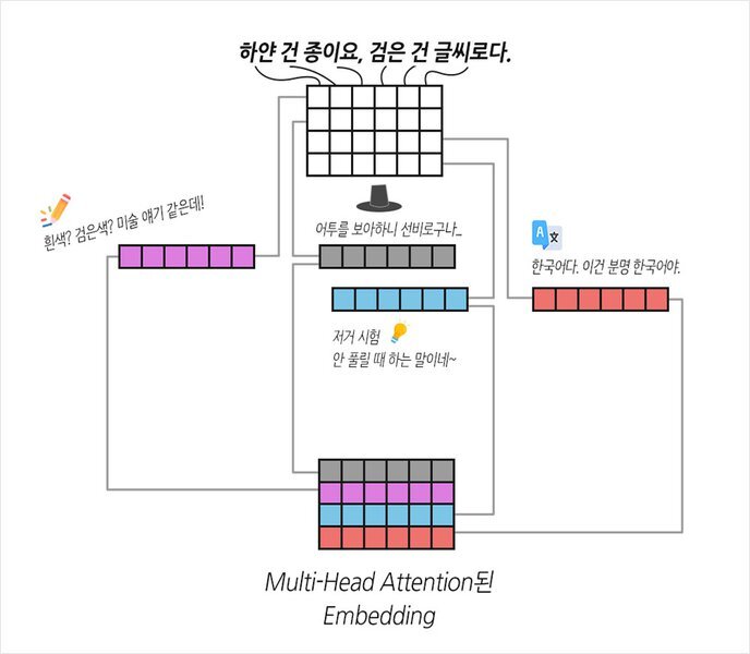 바나나라는 단어가 512차원 임베딩을 가진다고 볼 경우, 64차원은 노란색, 64차원은 달콤한 맛에 대한 정보를 표현하며 기타 가격과 유통기한까지 표현될 수 있음. 저자들은 이 정보를 섞지말고 여러 Head로 나누어 처리해서 Embedding의 다양한 정보를 캐치하고자 함