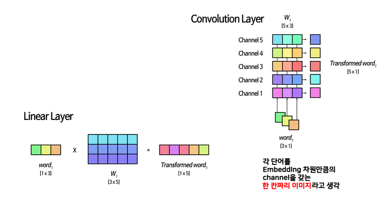 Convolutional 레이어의 Weight는 [입력 차원 수 X 출력 차원 수 X 커널의 크기] 이므로 커널의 크기가 1일 경우 Linear 레이어와 동일한 크기의 Weight를 갖게 됨