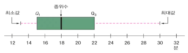 - 최소값 = 13분, Q1 = 15분, 중위수 = 18분, Q3 = 22분, 최대값 = 30분
