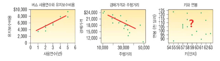 - 점들이 왼쪽 하단으로부터 오른쪽 상단으로 퍼져 있으면 그 변수들은 양의 관계를 가짐